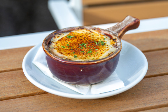 엑스트라 스위트 마우이 및 에와 양파 | 신선한 백리향 | 풍부한 쇠고기 육수 | 구운 바게트 | 브륄레드 그뤼에르 치즈