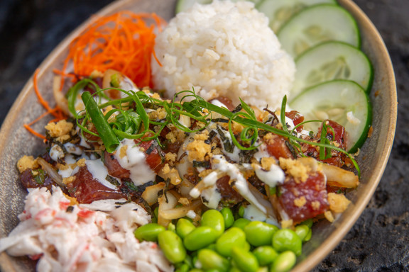 아히 | 에다마메 | 하우스 포케 소스 | 현지산 달콤한 양파 | 파 | 리무 | 모조 게살 샐러드 | 갈릭 크런치 아이올리 | 백미